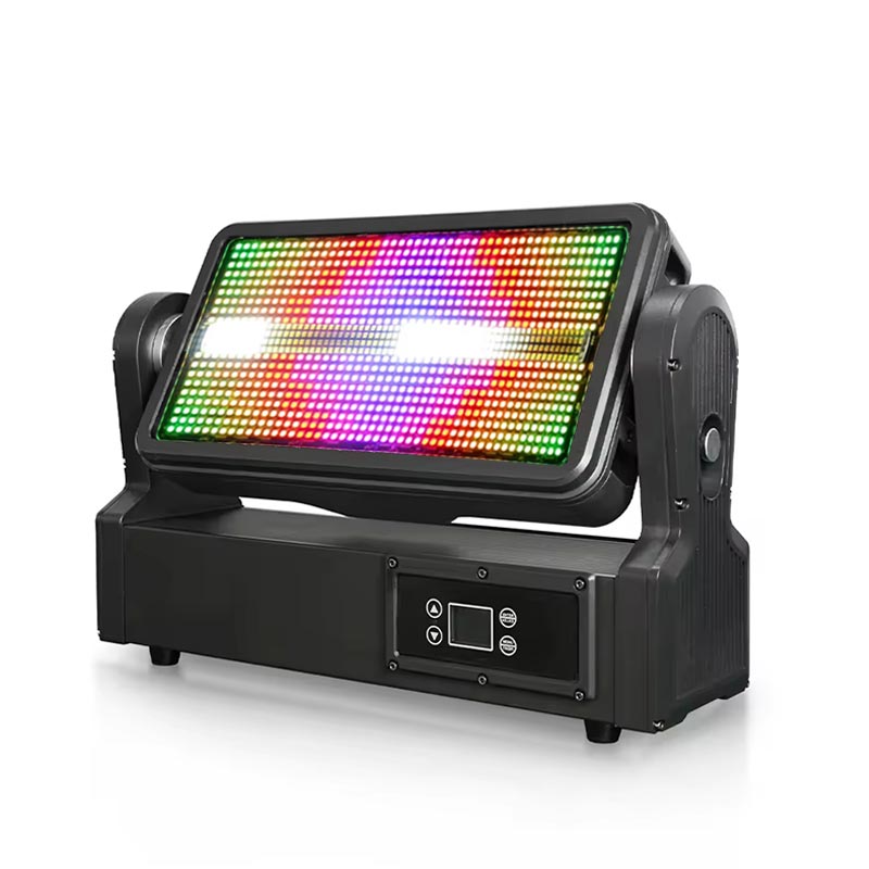 Moving Strobe MS1000IP is a 1000W IP65-rated waterproof moving strobe light, designed for both outdoor and stage applications. It features 128 individually controllable segments, including a panel with 864 × 0.5W RGB LEDs (96 segments) and a central tube with 256 × 3W white LEDs (32 segments). The fixture also comes with built-in macro programs, giving lighting designers greater flexibility and creative options during live shows.